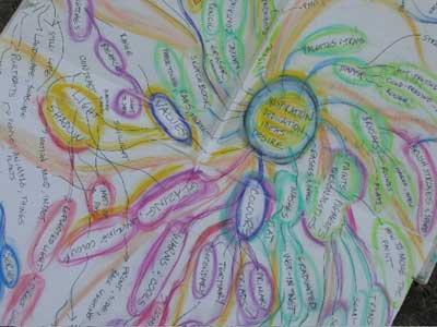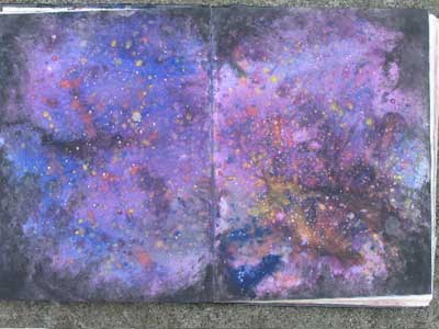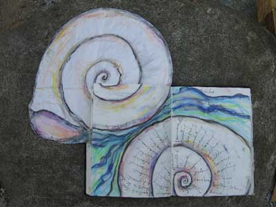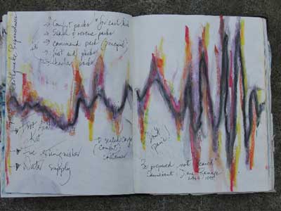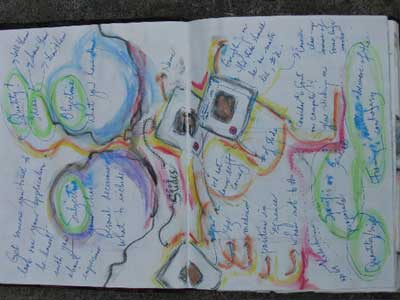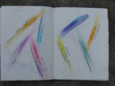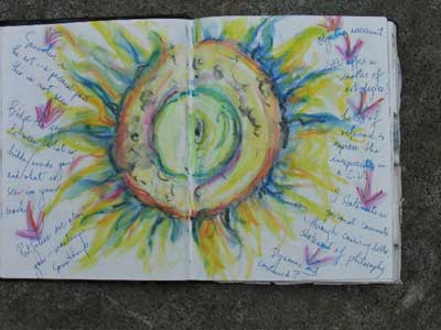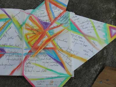 “The pages themselves can change shape. I like to encourage myself to try new ways of designing and representing ideas, from cutting the pages to fit the theme of whatever I’m writing about, to ‘stretching’ out the size of the pages to correspond to the measure of the thoughts that are coming to me. Why limit imagination because the page is given to you in one particular size or form?!! Even changing the writing implement you use can affect the flow of what you’re doing. I have been amazed over the years to see how dramatically these changes can affect my ability to think beyond where I thought I could go. Adventuring in so many diverse ways opens up the mind.
